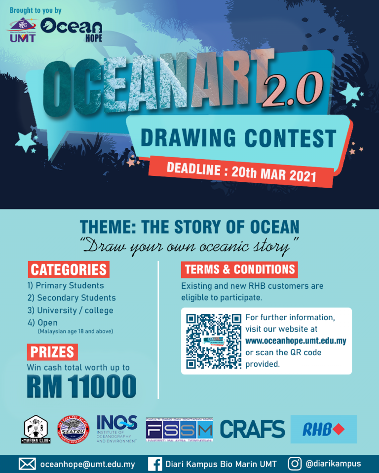 This contest is organized as part of the Ocean Hope campaign to increase ocean literacy among Malaysians. It is hoped that by participating in this competition, contestants will start to learn more about the ocean. At the same time, the organizer would like to appreciate the RHB Islamic Bank customers who have supported the ocean harmony initiative. Contestants are also encouraged to visit our Ocean Hope Portal to learn more about the ocean and to find the updated information about this competition. More information about this contest is also available at our official social media. Follow us on Facebook and Instagram @Diari Kampus Bio Marin UMT.