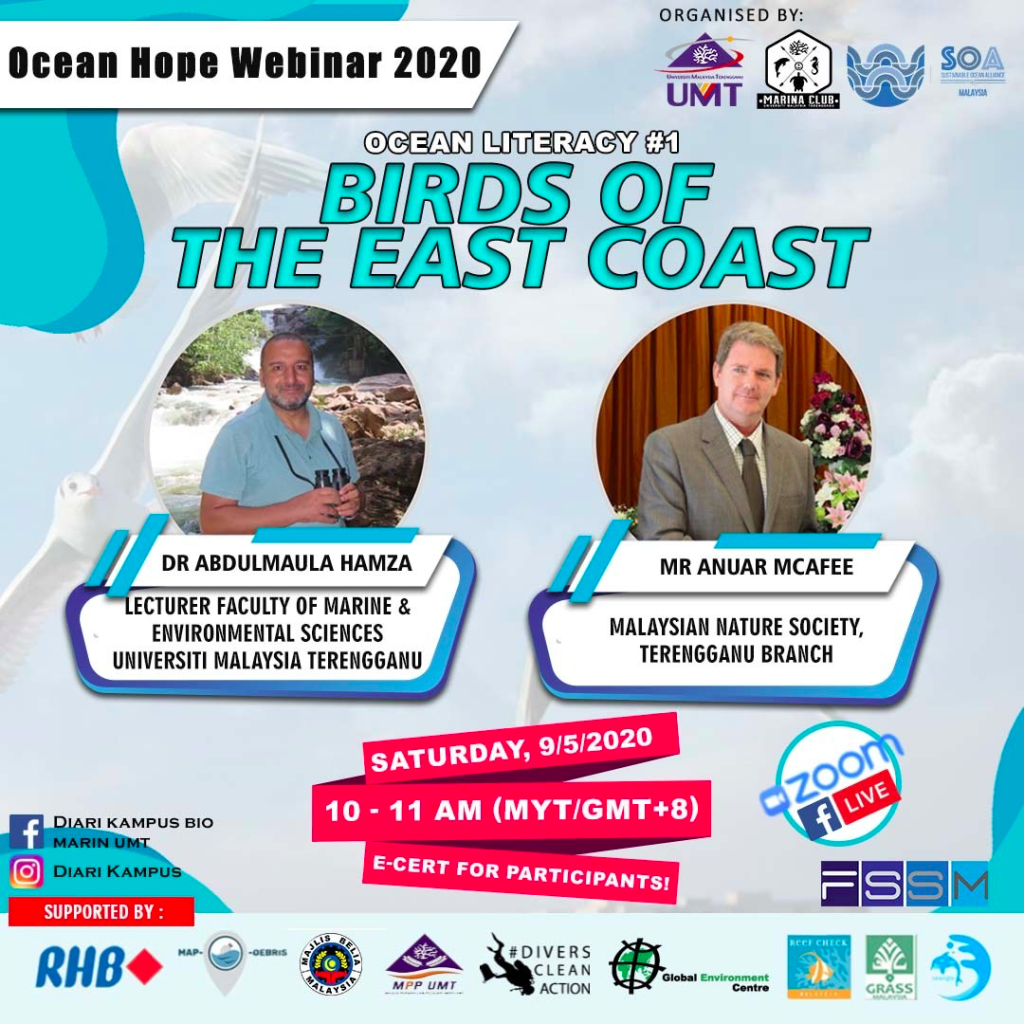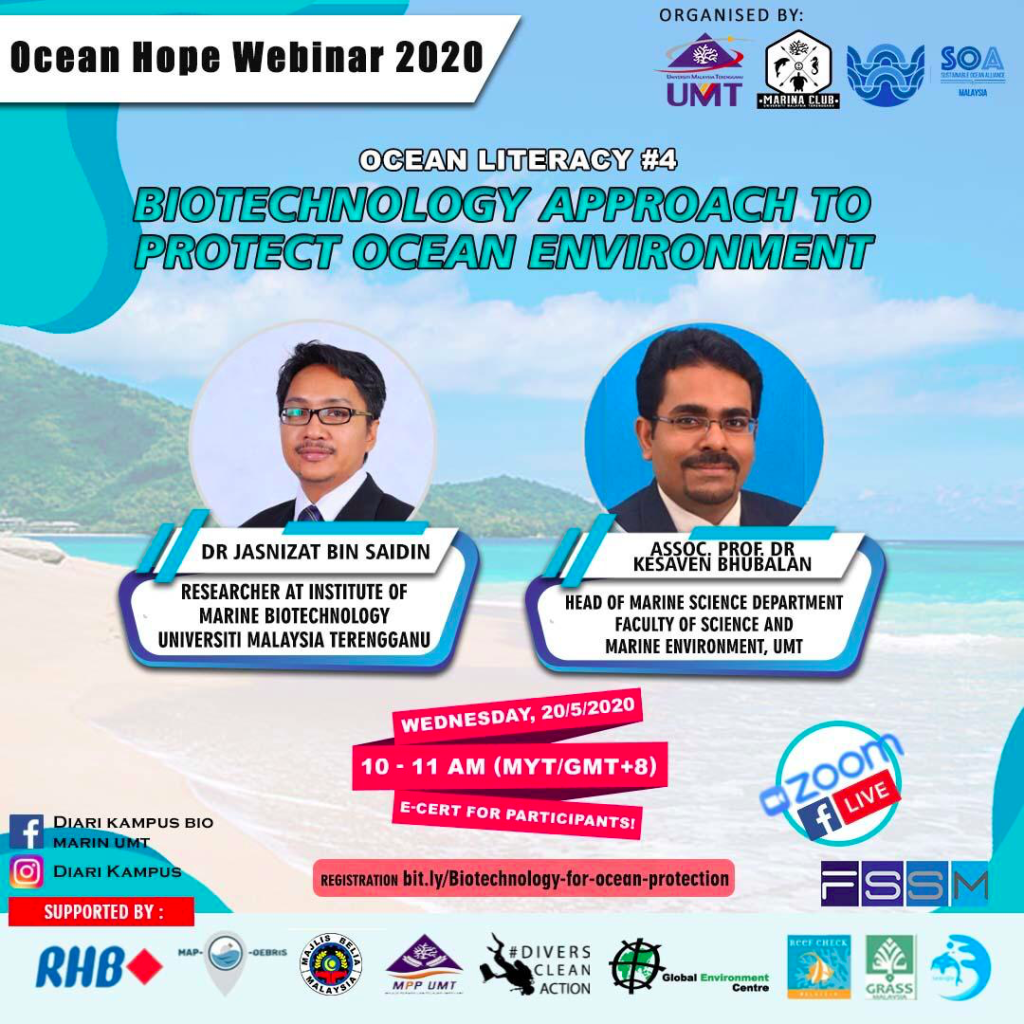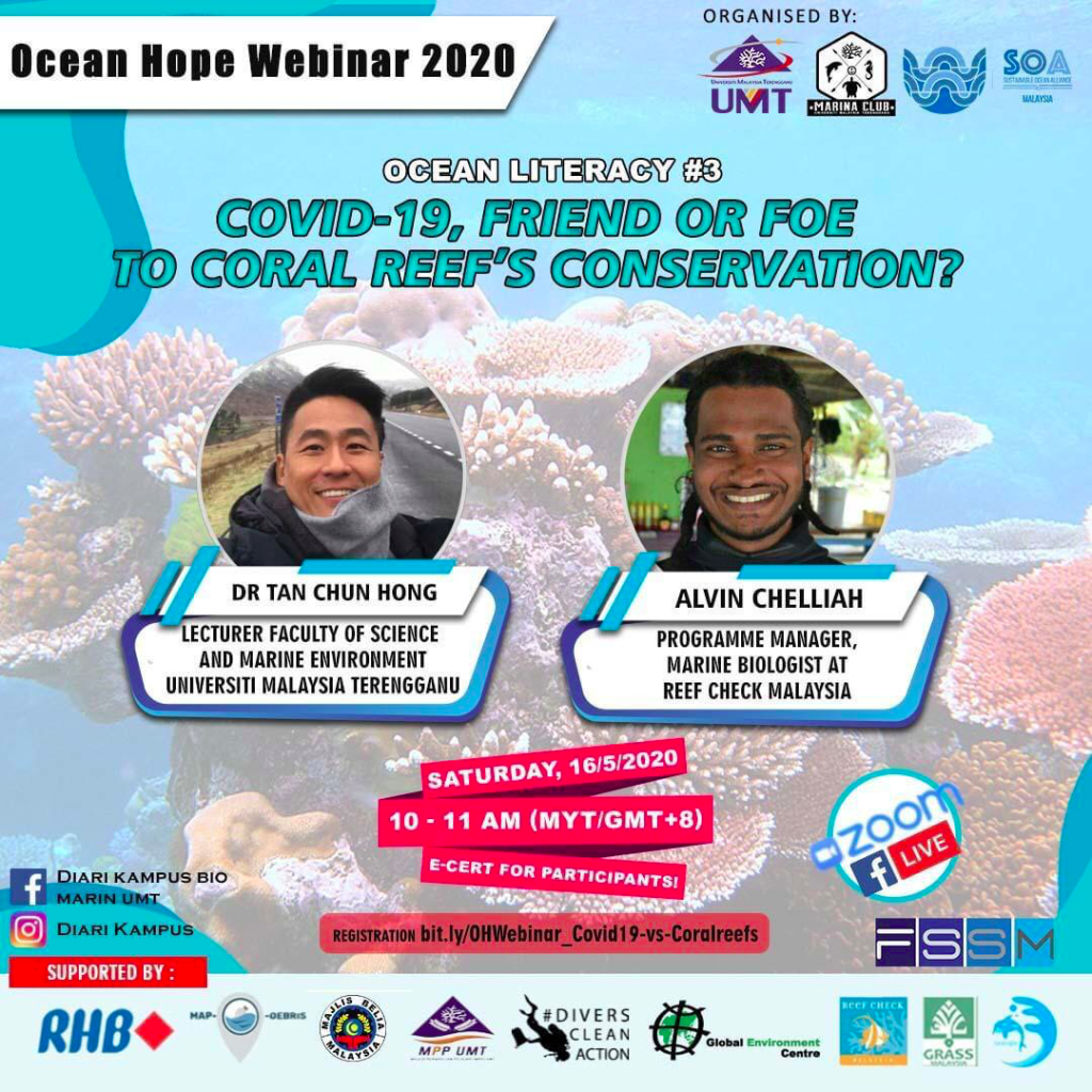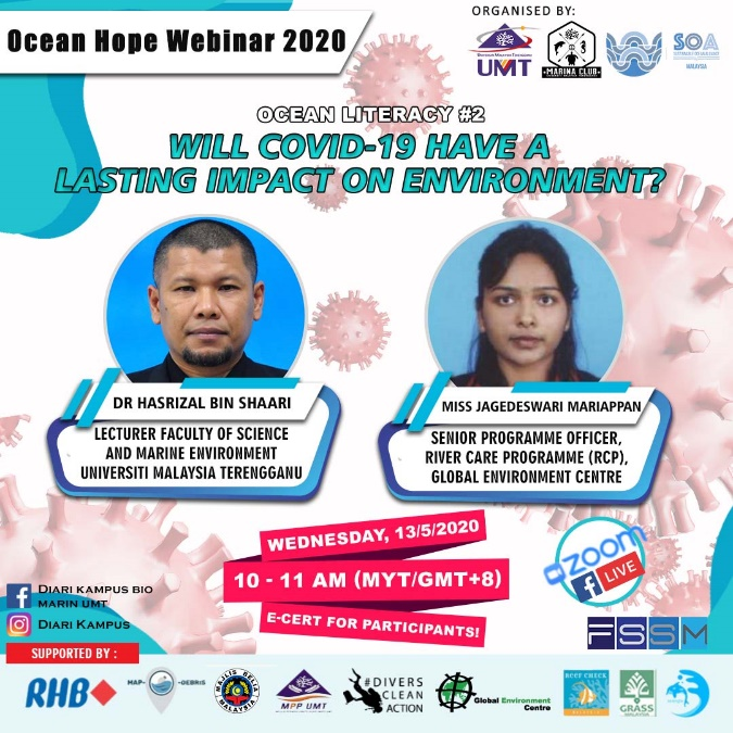Coronavirus disease (COVID-19) is spreading globally, which does not merely affect human health, but consequently affects the world economy and the environment significantly. While there are diverse ways of short-term and long-term effects of the pandemic, the Ocean Hope Webinar 2020: Ocean Literacy had invited together various local and international NGOs to come together to give light on experts view on the implications of COVID-19 to the marine realm in their respective field.